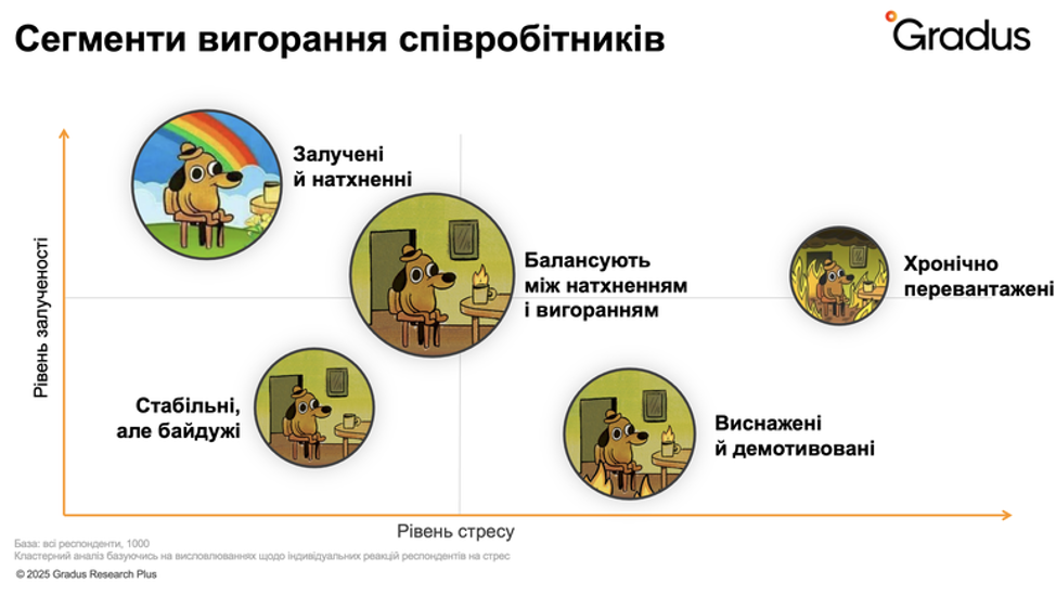 Дослідження Gradus Research (Євгенія Близнюк) показало: 75% хронічно перевантажених співробітників замислюються про звільнення. Навіть залучені та натхненні (18%) не застраховані від стресу.